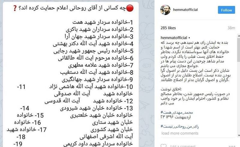 نودیها:فرزند شهید همت به دروغ حلقه تبلیغاتی روحانی در قراردادن نام خانواده شهید همت در لیست حامیان روحانی، اعتراض کرد.