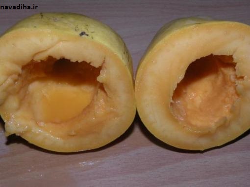 مواد اولیه یک عدد انبه یک چاقو گام ۱ ابتدا به کمک یک چاقو شیاری را در وسط انبه