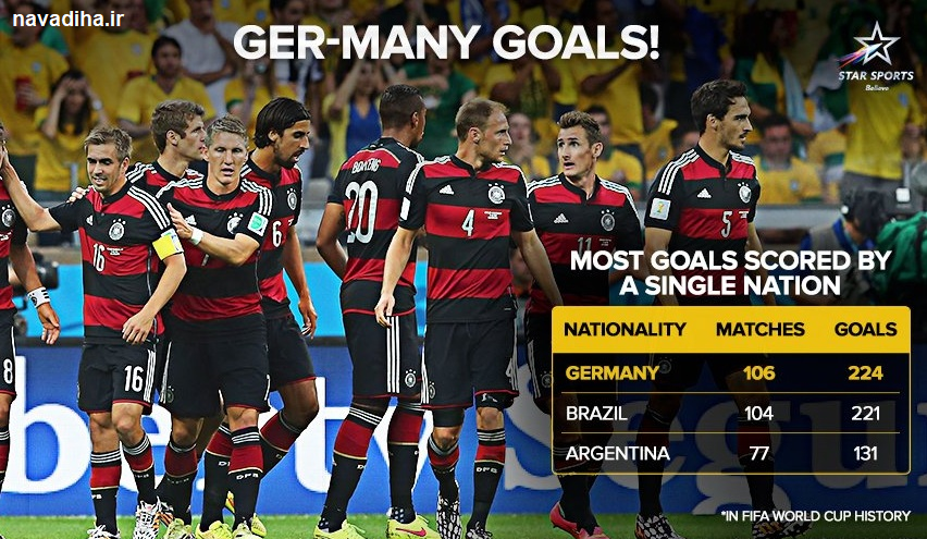 ژرمن ها با تعداد ۱۰۶ بازی و ۲۲۴ گل زده بالاتر از برزیل باسابقه ترین تیم حاضر در جام جهانی محسوب می شوند و رکورددار هستند.