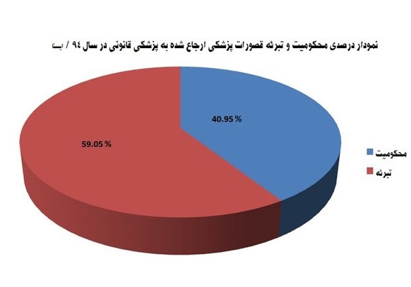 پیگیری خبرنگار ایسنا از پروندههای قصور پزشکی از پزشکی قانونی نشان داد که سال گذشته ۷۳۸۱ مورد پرونده قصور پزشکی از سوی دادسرای جرائم پزشکی به این سازمان ارجاع شده که ۴۳۵۸ مورد آن منجر به تبرئه شده و ۳۰۲۳ مورد نیز با محکومیت پزشک خاطی همراه بوده است. به عبارتی دیگر در سالی که گذشت تنها ۴۰.۹۵ درصد از شکایتهای مربوط به قصور پزشکی در پزشکی قانونی به محکومیت منجر شده و مابقی با تبرئه پزشک به اتمام رسیده است. همچنین ازجمع ۷۳۸۱ شکایتی که در سال گذشته به پزشکی قانونی ارجاع شده، ۱۰۹ مورد آن مربوط به گروههای غیر پزشکی بوده که از این تعداد ۷۳ مورد محکوم و ۳۶ مورد تبرئه شدهاند.