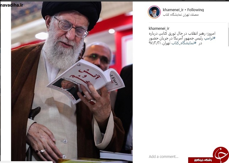 رهبر انقلاب در حال تورق کتابی درباره ترامپ رئیس جمهور آمریکا در جریان حضور در نمایشگاه کتاب تهران