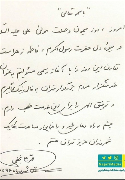 امروز، روز میمون وصلت علی علیه السلام و میوه دل حضرت رسول اکرم، فاطمه زهرا است.تقارن این روز را با آغاز رسمی مسئولیتم به عنوان خدمتگزار مردم بزرگوار تهران به فال نیک میگیرم و توفیق الهی را برای این خدمت طلب دارم.چشم به راه دعای خیر و راهنمایی و مساعدت یکایک شهروندان عزیز تهران هستم.»