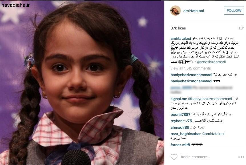 تتلو با انتشار تصویری از آرمیتا رضایی نژاد دختر شهید داریوش رضایی نژاد نوشت که قصد دارد تا در قدم بعدیاش، «هدیهای کوچک به فرشتهای کوچک» تقدیم کند.