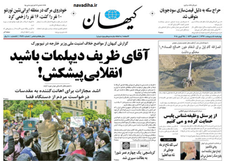 چهارشنبه هفته گذشته- ۵ اردیبهشت- کیهان در گزارشی با عنوان «آقای ظریف دیپلمات باشید، انقلابی پیشکش!» به اظهارات تأملبرانگیز و خلاف منافع ملی وزیر امور خارجه در شورای روابط خارجی آمریکا واکنش نشان داد.