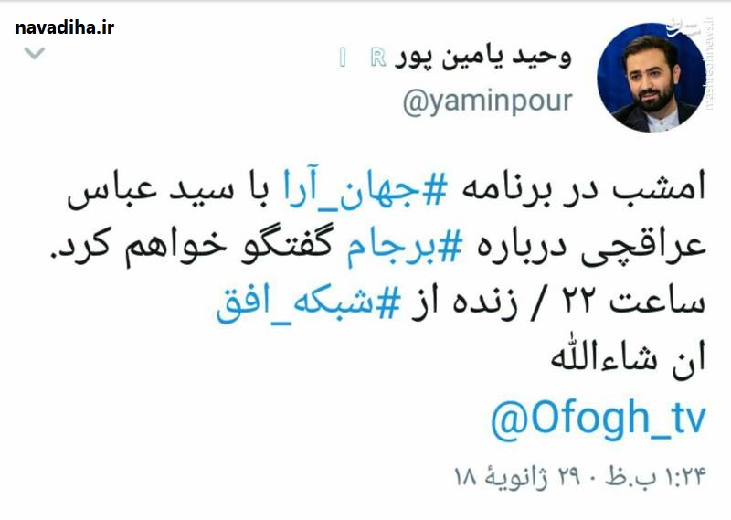 نودیها:وحید یامین پور در توئیتر خود نوشت: امشب در برنامه جهان آرا با عباس عراقچی درباره برجام گفتگو خواهم کرد .ساعت ۲۲/شبکه افق