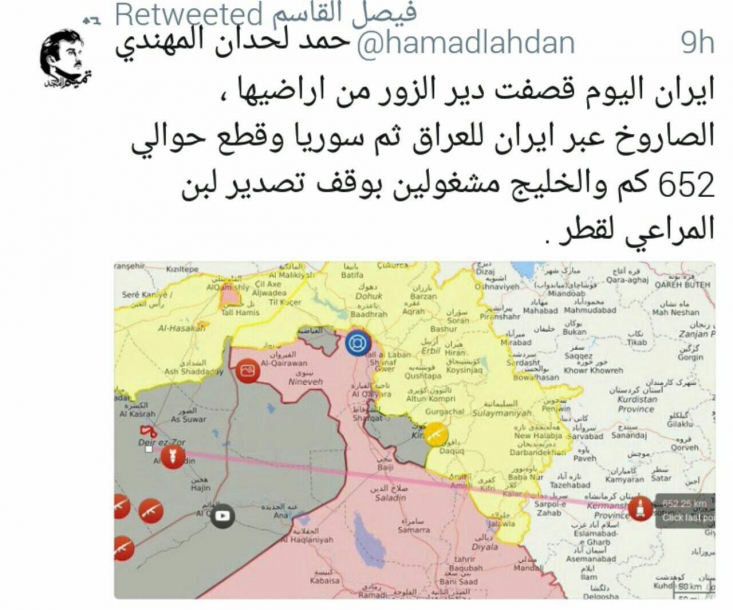 نودیها:توییت مقام قطری : ایران موشکی از فاصله ۶۵۲ کیلومتری به سوریه شلیک کرده و کشورهای خلیج فارس مشغول قطع صادرات شیر به قطر هستند