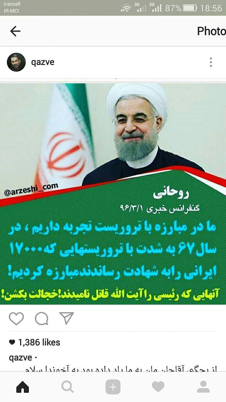 آ شیخ حسن روحانی!شما چهار سال دیگر تمامی و می روی!چیزی که از آدم می ماند جوانمردی و معرفت است!دروغ می گویم بفرمایید دروغ است!شما این فرمایش های گوهر بار را دقیقا کی فرمایش فرمودید؟!دو روز بعد از انتخابات؟یعنی دقیقا وقتی خرتان از پل گذشت؟یعنی نمی شد دو سه روز قبل و یا حتی در اوج همان بزن بزن های انتخاباتی و لوله و لوله کشی و درست در زمانی که تمام کانال های اجاره ای شما مشغول رصد فتوای قاتل بودن رقیب بودند این فرمایش گوهربار را می فرمودید که این کارها اخ است و در روز قیامت یک جاهایی آدمیزاد را چیز می کنند!