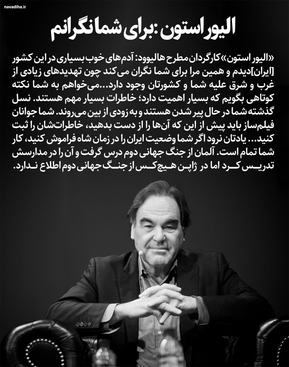 1 آخرین مطالب اخبار اخبار روزدرس اولیور استون چهره سرشناس هالیوود به مسئولان وطنی ! موسوی - مدیر اصلی8 سال ago4 هفته ago01 mins انصار کلیپ برای امتیاز دادن به این مطلب اینجا کلیک کن [کل آراء: 0 میانگین: 0] راهبری نوشته Previous: درخواست جوان ‘جین پوش’ از حاج قاسم!Next: استاد رائفی پور:”سقط جنین” شیوه مدرن قتل به روش اعراب جاهلی دیدگاهتان را بنویسیدنشانی ایمیل شما منتشر نخواهد شد. بخشهای موردنیاز علامتگذاری شدهاند *دیدگاه * نام ایمیل وب سایت