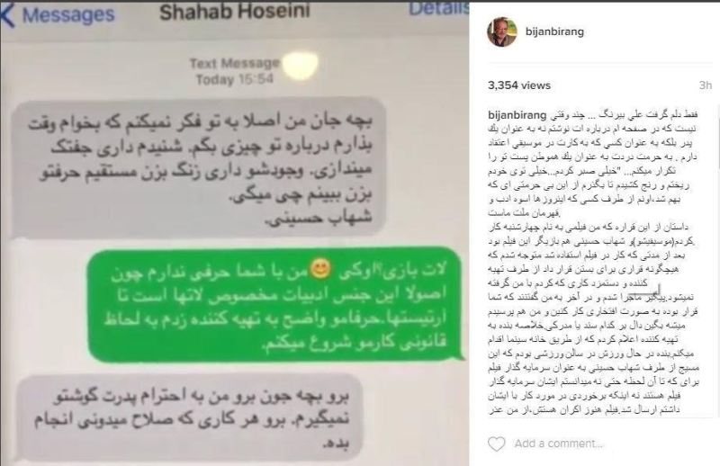بنده در حال ورزش در سالن ورزشی بودم که این مسیج از طرف شهاب حسینی به عنوان سرمایه گذار فیلم برای که تا آن لحظه حتی نه میدانستم ایشان سرمایه گذار فیلم هستند نه اینکه برخوردی در مورد کار با ایشان داشتم ارسال شد. فیلم هنوز اکران هستش، از من عذر خواهی ای نشده و دستمزدم هم نگرفتم.