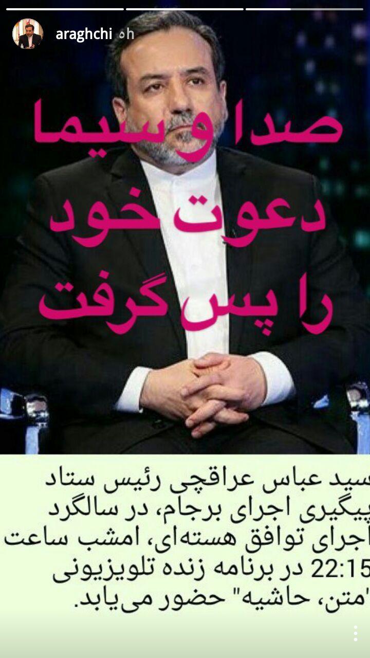 این در حالی است که عراقچی در صفحه شخصی اینستاگرام خود بعد از اعلام حضور در این برنامه، با الزامی شدن حضور یک منتقد در این برنامه از شرکت در آن سر باز زد و در پستی دیگر مدعی شد تلویزیون دعوت خود را پس گرفته است!