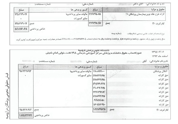 این حقوقها حتی در شهرهای بزرگ نیز دیده میشود. مثلاً در فیش شماره یک، کارانه اسفندماه سال ۹۳ یکی از پزشکان بیمارستانی در ارومیه نشان میدهد که این پزشک بیش از ۲۰۰ میلیون تومان درآمد داشته که با احتساب پرداخت مالیات نزدیک به ۱۸۸ میلیون تومان دریافتی داشته است. این دریافتیها نه فقط با اظهارات سخنگوی وزارت بهداشت تناقض دارد بلکه حاکی از نحوه هزینهکرد بودجه طرح سلامت است. طرحی که با این پرداختیها دیر یا زود کفگیرش به ته دیگ میخورد!
