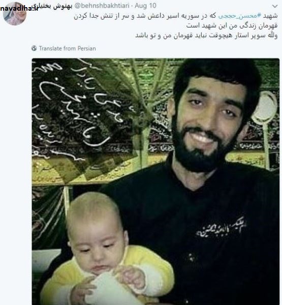بختیاری در توئیترش نوشت: شهید محسن حججی که در سوریه اسیر داعش شد و سر از تنش جدا کردن قهرمان زندگی من این شهید است والله سوپر استار هیچوقت نباید قهرمان من و تو باشد.