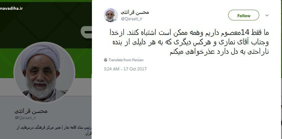 صفحه توئیتری آقای قرائتی نیز از قول ایشان نوشت: «ما فقط ۱۴ معصوم داریم و همه ممکن است اشتباه کنند. از خدا و جناب آقای نمازی و هرکس دیگری که به هردلیلی از بنده ناراحتی به دل دارد، عذرخواهی میکنم.»