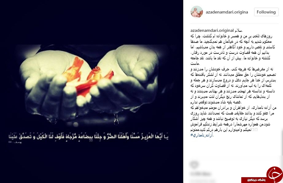 نه از قضاوت گران سرخود که دانسته و ندانسته هر تهمتی میزنند و هر بهتانی میبندند و نه از بددلهایی که از تماشای رنج دیگران لذت میبرند و از غصه بقیه شاد میشوند،توقعی ندارم. من آزاده نامداری، از خواهران و برادران مومنم میخواهم که مرا عفو کنند و بدانند حقایقی هست که نمیدانند. شاید روزی برسد که دیگر نیازی به توضیح نباشد و همه چیز آشکار شود.من همواره مهر شما را در همه شرایط زندگیم فراموش نمیکنم وامیدوارم این بارهم درکم کنید.ممنونم.”