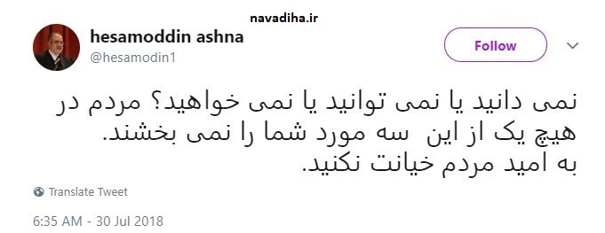 نودیها:حسام‌الدین آشنا مشاور فرهنگی رئیس‌جمهور درباره افزایش بی‌رویه قیمت دلار و سکه در توییتر خود نوشته است:‌ نمی‌دانید یا نمی‌توانید یا نمی‌خواهید؟ مردم در هیچ یک از این سه مورد شما را نمی‌بخشند؛ به امید مردم خیانت نکنید!