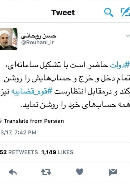 حسن روحانی رئیس جمهور کشورمان در حساب توئیتری خود در فضای مجازی نوشت «دولت حاضر است با تشکیل سامانهای، تمام دخل و خرج و حسابهایش را روشن کند و درمقابل انتظارست قوه قضاییه نیز همه حسابهای خود را روشن نماید».
