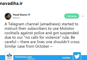 نودیها:کانال تلگرامی آمد نیوز پس از درخواست محمدجواد آذری جهرمی وزیر ارتباطات از پاول دوروف موسس تلگرام، مسدود شد. پاول دوروف، مدیر تلگرام پس از تعلیق «آمدنیوز» توضیح زیر را منتشر کرد: «کانال تلگرامی آمدنیوز از دنبالکنندگانش تقاضای استفاده از بمبهای دستی (کوکتل مولوتوف) علیه پلیس کرده بود که بهدلیل نقض سیاست “ممنوعیت درخواست برای…