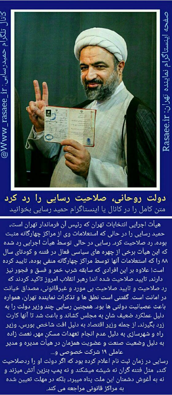 اما حمید رسایی در حالی توسط عناصر دولت آقای روحانی در فرمانداری تهران رد صلاحیت شده است که نه تنها پاسخ استعلامات وی از مراکز چهارگانه مثبت بوده بلکه وی گلیه مستندات اشاره شده را طی یک نامه رسمی در روزهای گذشته و پس از ثبت نام در انتخابات تحویل فرمانداری تهران داد اما برخی چهره های سیاسی که در فتنه و کودتای سال ۸۸ نقش جدی داشته اند، از جمله فردی که در محل تحت مدیریت وی اسلحه کشف شده بود و در استعلامات ارائه شده توسط مراکز همین دولت، صلاحیت آنها برای انتخابات رد شده است، توسط فرمانداری تهران تأیید شده اند! حتی افرادی با سابقه شرابخواری و مشهور به فسق و فجور نیز که قلم از ذکر آنها شرم دارد، توسط هیأت اجرایی تأیید صلاحیت شده اند!مقام معظم رهبری امروز تأکید کرده بودند که رد صلاحیت و تأیید صلاحیت بی مورد و غیرقانونی، مصداق خیانت در حق الناس است.