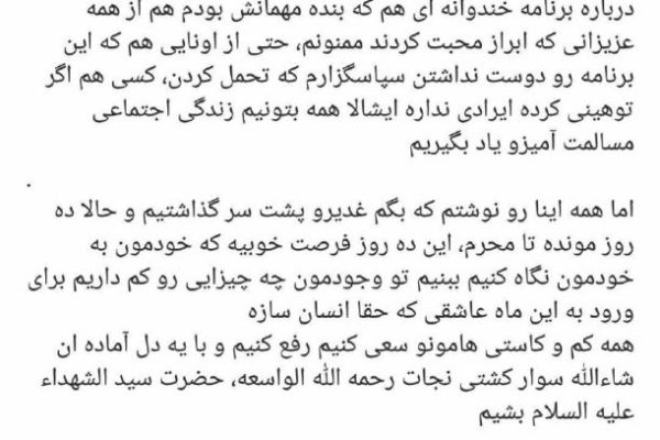 نودیها: سید مجید بنی فاطمه به اظهار نظرهای منتقدین و موافقین حضورش در برنامه خندوانه پاسخی درخور شان یک مداح اهل بیت داد. سید مجید بنی فاطمه در اینستاگرام خود نوشت: درباره برنامه خندوانه ای که بنده مهمانش بودم از همه عزیزانی که ابراز محبت کردند ممنونم، حتی از اونایی هم که این برنامه رو…