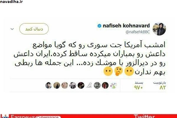 نودیها:نفیسه کوهنورد خبرنگار BBC در پست توئیتری نوشت: «آمریکا جت سوری رو که گویا مواضع داعش رو بمباران میکرده، ساقط کرده. ایران داعش رو در دیرالزور با موشک زده … این جمله ها ربطی بهم ندارن؟» فارس