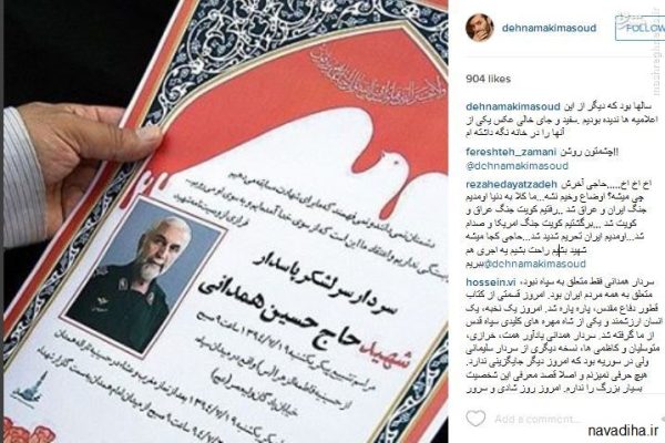 مسعود ده نمکی در صفحه شخصی خود با انتشار این عکس نوشت: «سالها بود که دیگر از این اعلامیه ها ندیده بودیم . سفید و جای خالی عکس یکی از آنها را در خانه نگه داشته ام.» منبع:جام نیوز به نقل از مشرق