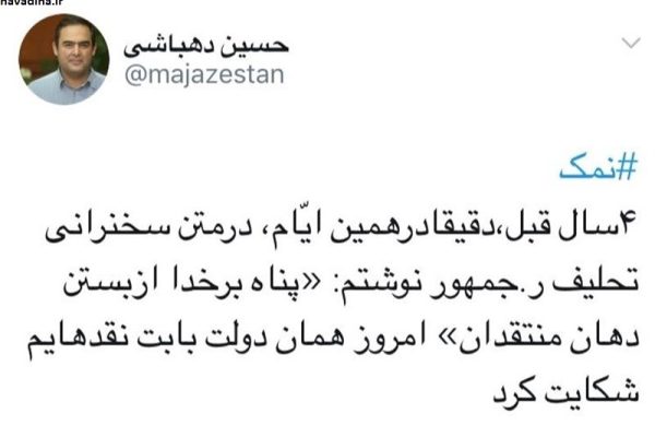 نودیها:حسین دهباشی سازنده مستند انتخاباتی حسن روحانی در انتخابات ۹۲ طی مطلبی در صفحه اجتماعی خود، طی مطلبی نوشت: ۴ سال قبل دقیقاً در همین ایام و در متن سخنرانی تحلیف رئیس جمهور نوشتم ” پناه بر خدا از بستن دهان منتقدان”؛ امروز همان دولت بابت نقدهایم شکایت کرد. انتقادهای دهباشی از دولت روحانی، غالباً…